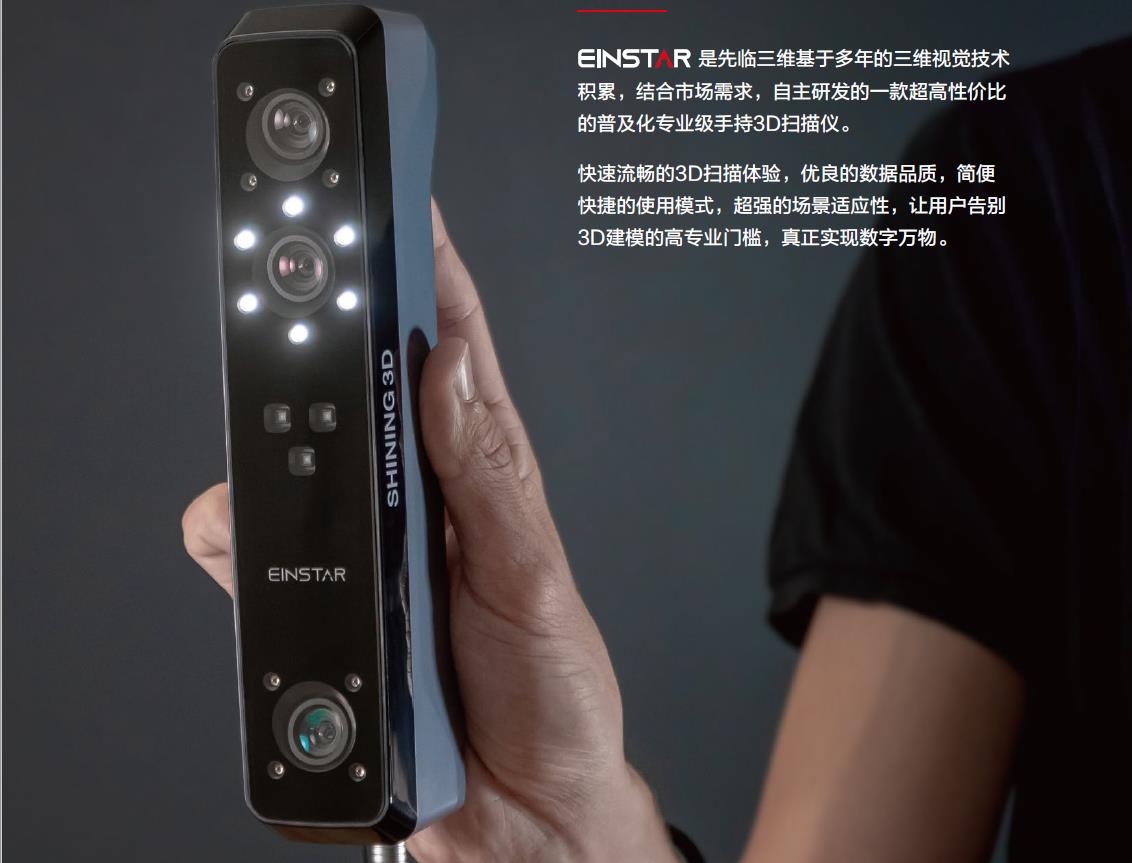 Einstar基于多年的三維視覺技術積累,結合市場需求,自主研發的一款超高性價比的普及化專業級手持3D掃描儀。 快速流暢的3D掃描體驗,優良的數據品質,簡便快捷的使用模式,超強的場景適應性,讓用戶告別